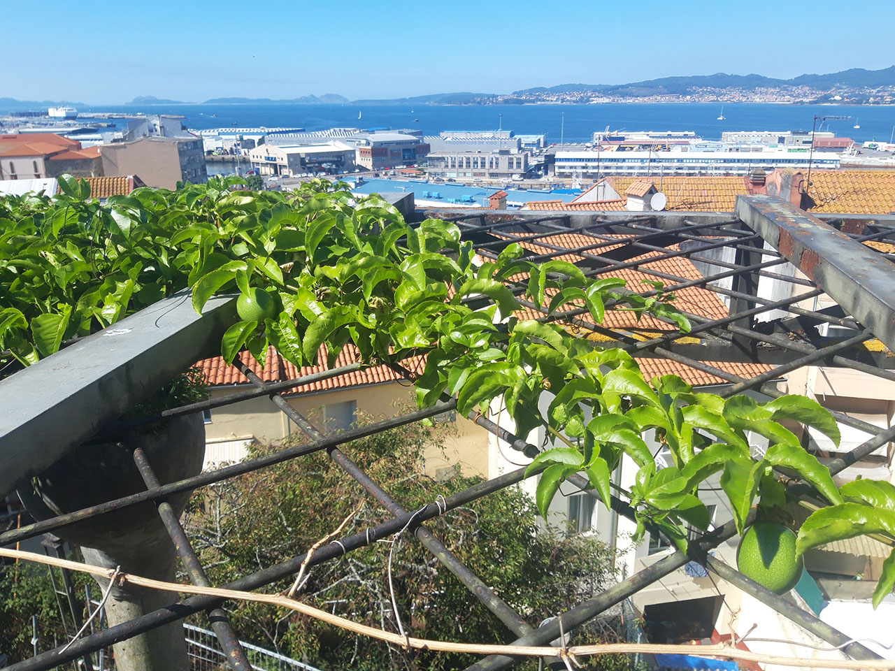 Quisimos plantar la pérgola existente, del Mirador del Paseo Alfonso XII, con plantas enredaderas. Para ello realizamos grandes tiestos colgantes plantados con uva-fresa y maracuyá.
